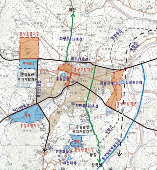 홍성읍 지역종합개발사업에서 남장지구와 옥암지구, 소향지구 내 월산지역이 개발 대상지역에서 조만간 제외되게 된다.