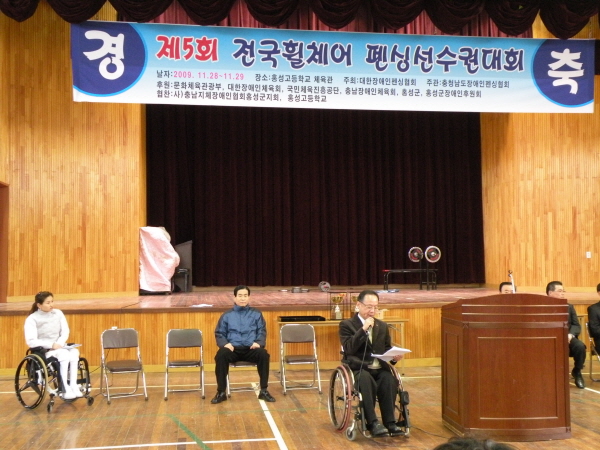 충남도장애인펜싱협회(회장 김호현․홍성지체장애인협회장)는 지난달 28일~29일 이틀간 홍성고등학교 체육관에서 전국 시도 휠체어 펜싱선수, 관계자 등 80여명이 참가한 가운데 제5회 전국휠체어 펜싱 선수권대회를 개최했다.