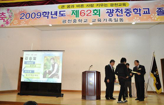 지난 11일 광천중학교(교장 박용래) 제62회 졸업식이 학교 청운관 강당에서 치러진 가운데 이날 총동문회 김재수 회장은 졸업생 전원에게 10만원의 장학금이 입금된 통장 및 장학증서를 전달해 졸업식에 참석한 졸업생 및 학부모, 지역주민들이 아름다운 졸업의 기쁨을 만끽할 수 있도록 했다. 또 널리 사랑이 펼쳐지는 사회의 중요성을 몸으로 실감할 수 있는 계기를 마련해줬다.