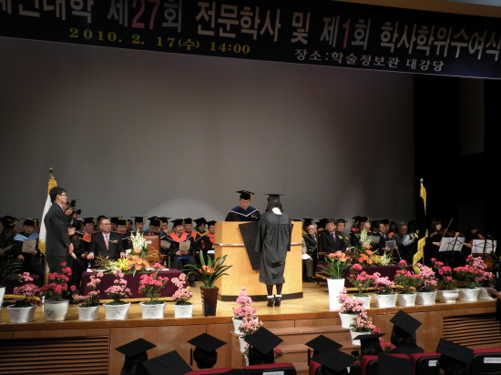 혜전대학(학장 이재호)은 제27회 전문학사학위수여식 및 제1회 학사학위수여식을 교내 학술정보관에서 개최했다. 이날 식에서 졸업을 맞는 학위수여자는 23개 학과, 총1102명이 전문학사 및 학사학위를 받았다. 아울러 이번 졸업생들 중에 학사학위를 받은 정보경(호텔제과제빵과) 학생이 전체수석을 차지하며 이준호 이사장에게 상장을 수여받았다. 또 김지영(패션스타일리스트과) 학생 등 28명이 총장상을, 김소망(호텔조리외식계열) 학생 등 16명이 공로상을, 김재민(애완동물관리과) 학생 등 4명이 문화상을, 변성경(호텔조리외식계열) 학생 등 3명이 각각 봉사상과 총동창회장상을 수상하는 영광을 안았다.
