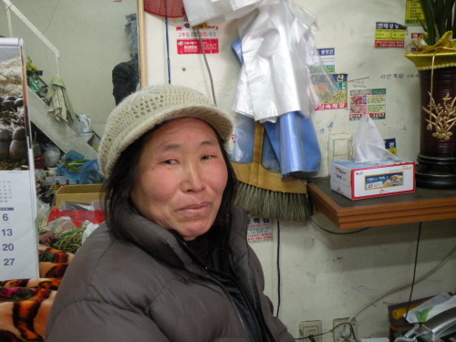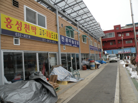 "사람들이 많아야 하는데…. 시장을 찾는 사람들이 점점 줄어들어. 그리고 마늘전 앞도 텅비어 있어"라며 "노점상들을 위해 마늘전 앞 넓은 터를 만들었는데 노점상들이 이곳에 안 들어와. 뭔가 대책이 나와야지"라고 말하며 즐거움보다는 한숨이 먼저 나온다는 새로 지은 마늘전 홍성천막 고추·마늘 도소매 점포를 운영하는 송태봉(77)·박경숙(68) 씨 부부. 박 씨는 요즘 시장을 찾는 사람들이 줄어 걱정이라고 한다. 왜 간판에 홍성천막이란 말을 써놓았는지 물었더니 박 씨는 "원래 우리 바깥양반이 천막사를 했지. 사람들이 천막사를 더 많이 기억하니 찾기 쉬우라고 써놓은 거지"라며 싱겁게 웃는다.
