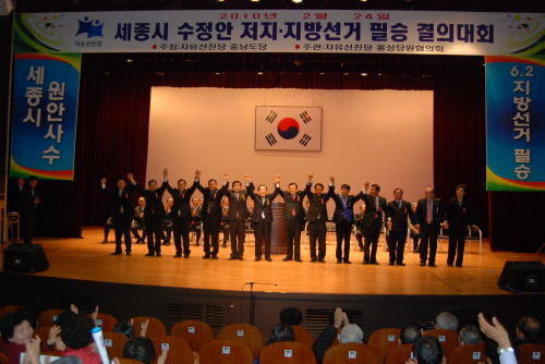이회창 총재는 "이명박 정부 들어서서 국민들은 불안해하고 세종시를 갑자기 뒤집어 증오와 대립, 갈등의 도가니로 만들었다. 오는 6·2 지방선거를 이명박 정권 2년을 심판하는 날로 만들고 자유선진당 후보들이 모두 당선될 수 있도록 힘을 모아나가자. 나부터 홍성을 위해 열심히 뛰겠다. 당원들의 압도적인 지지를 보여달라"고 강조했다.