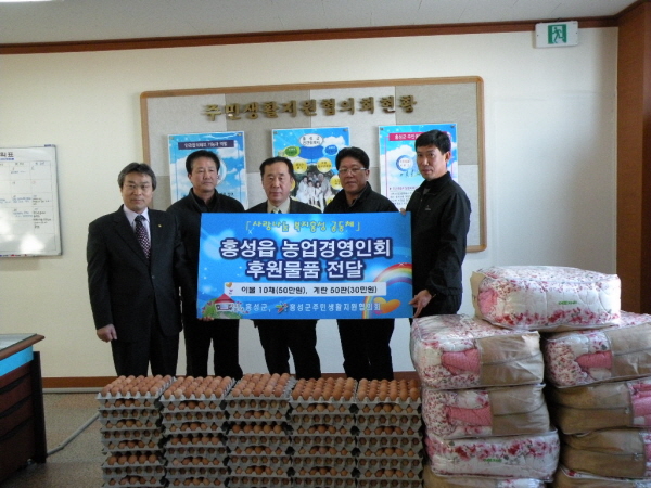 홍성읍 농업경영인회(회장 이범웅) 회원들은 지난 19일 홍성군주민생활지원협의회(대표위원장 이동춘)을 방문해 80만원 상당의 물품(이불 10채, 계란 50판)을 전달했고, 이에 주민생활지원협의회는 후원물품을 시각장애인연합회홍성지회와 지체장애인홍성지회, 읍내 홀로 사는 노인어르신 15명에게 전달해 이웃사랑을 몸소 실천했다.