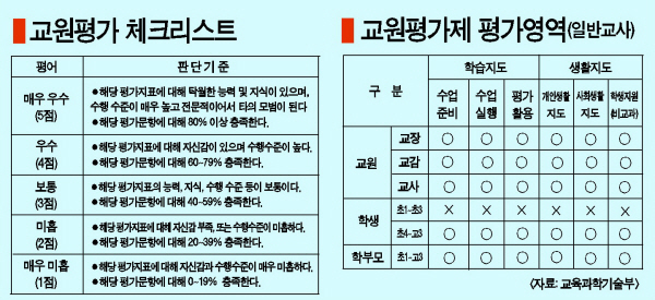 평가방법은 교사는 학습지도와 생활지도에 관한 18개 항목을 중심으로 교장이나 교감 중 1명 이상과 동료교원 3명이 참여하는 <교원평가>와 자신이 직접 가르치는 학생과 학부모가 참여하는 <만족도 조사>로 이뤄지며 초등학교 1~3학년 학생은 평가에 참여하지 않는다. 교장과 교감은 학교 경영 전반에 대한 학교교육 계획, 장학, 교원인사, 시설 및 예산 등 8개 지표를 중심으로 전체 교사와 학부모로부터 평가 받게 된다. 평가주체는 교장은 교감·교사·학부모이며 교감은 교장·교사·학부모이다.