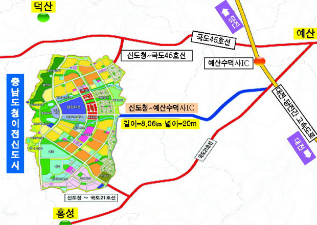충남도청 신도시의 부지 조성공사가 속도를 내고 있는 가운데 지역주민들의 최대 관심사는 새 도청으로 통하는 주 진입도로와 충남도청역의 위치이다. 지난 10일 현재 공사가 진행되고 있는 위치로 가늠해 볼 때 새 도청으로 통하는 주 진입도로는 신도시예정지의 경계까지는 윤곽을 드러냈다. 도청신도시에서 대전~당진간고속도로 예산수덕사IC까지 연결되는 8.06㎞ 구간의 폭 20미터의 주 진입도로(단지 내는 6차선, 외곽은 4차선 예정)는 현재 신도시 예정지 경계지점까지는 직선으로 조성되고 있다. 현재 조성되는 도로가 직선으로 장항선을 통과하면서 국도 21호선으로 연결될 것으로 예상한다면 신도시 외곽 방향으로는 홍북면 석택리의 석교마을과 택리마을의 경계지점의 산으로 관통될 것으로 전망된다. 이 노선은 마을이 없고 산으로 돼 있어 전망을 높게 하고 있다. 다만 묘지가 산재돼 있으나 노선에 따라서는 묘지가 많은 곳을 피할 수 있다는 장점이 있어 가능성이 높은 편이다.