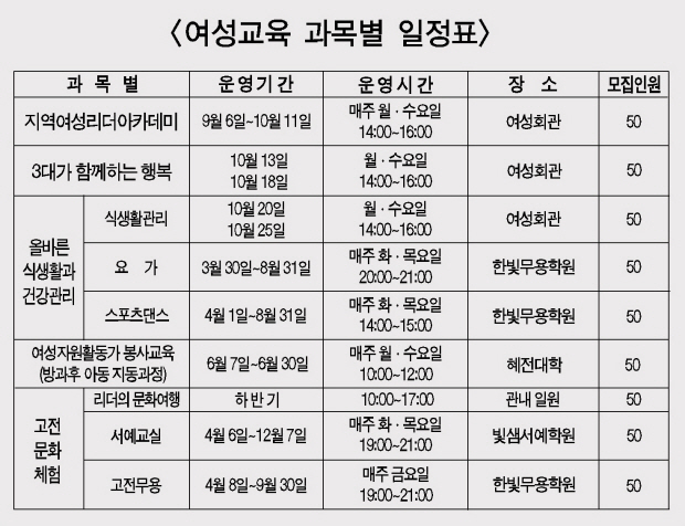 이번 교육은 5개과목 9개 과정으로 여성회관에서 운영되며 오는 30일 개강식을 시작으로 수업이 시작된다. 군민 400여명을 대상으로 실시되는 이번 교육의 주요프로그램으로는 지역여성 리더 아카데미, 3대가 함께하는 행복, 올바른 식생활과 건강관리, 여성자원활동가 전문교육, 고전문화체험(자세한 내용 표 참조)에 관한 교육이 실시된다.
