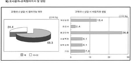 위와 같은 교육이나 상담 시행 시 참여 가능여부에 대하여 조사한 결과 68.3%가 참여하겠다고 답했는데, 베트남 여성들은 그보다 더 높은 72,7%가 교육이나 상담에 참여할 것이라고 응답하여 교육상담이 매우필요하다는 의견을 갖고 있다. 교육이나 상담의 바람직한 방법에 대하여 베트남 여성들은 무응답을 제외하고 YMCA 등 종교단체가 가장 높게 나타났다.