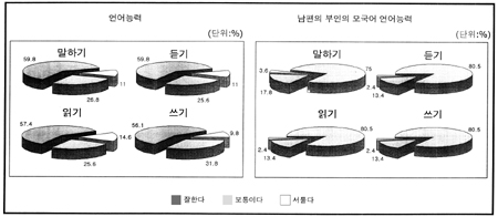 한국어 언어능력은 말하기, 듣기, 읽기, 쓰기 모든 부분에서 30% 이상이 ‘매우잘한다’고 응답했으나, 베트남 여성은 59.1%는 서툴다고 응답했다. 반면 국제결혼 이주여성의 남편의 경우는 50% 이상이 부인의 모국어에 대한 언어능력이 ‘매우서툴다’고 응답하여 베트남 여성과의 결혼이 증가하는 최근의 추세에 비추어 보면 부부간 언어소통 능력은 매우 문제가 있음을 알 수 있다.