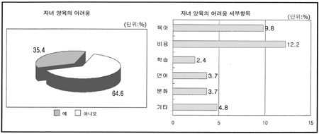 자녀양육 애로사항에 대해서는 65%가 애로사항이 없다고 답하였고 어려움이 있다고 응답한 이유