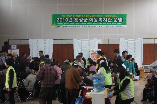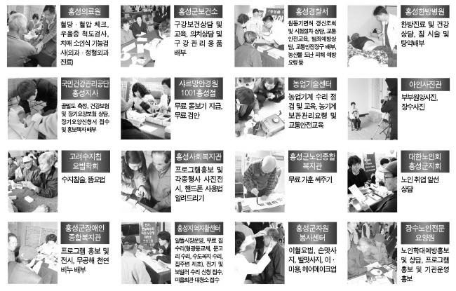 이번 이동복지관은 16개 단체가 참여한 가운데 홍성의료원과 군 보건소 등 5개 기관이 함께 몸이 불편한 어르신들을 직접 치료하는 한편, 혈압·당뇨·콜레스테롤 등 기초건강상태를 체크해 추후 발생할 수 있는 질병을 예방하고 건강한 노후생활을 영위할 수 있도록 했다. 또한, 홍성경찰서의 농산물 도난 피해 예방, 전화금융사기 예방 안내 등과 샤르망 안경원의 무료 검안과 돋보기 지급 등의 세심한 배려로 생활 속에서 불편을 겪지 않도록 지원했다.