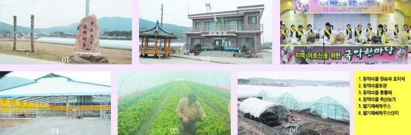 동막마을은 크게 4개의 반으로 이뤄져 있는데 절골, 윗동막, 아랫동막, 원마루로 나뉘며 현재 73세대 200여명이 거주하고 있다. 동막마을은 예로부터 마을 앞들인 구렛들을 제외하고는 콩심어도 콩이 안난다는 박토였다. 해서 새마을 사업 이후 통일벼가 확산됐지만 보릿고개를 넘기기도 어려웠다. 그러나 지금으로부터 30여년전 딸기 묘목이 도입되면서 마을은 새로운 활기를 되찾게 됐다. 적어도 배고픔을 면할 수 있었으며 지금은 부촌으로 성장했다. 해서 동막마을의 주수입원은 대부분의 농가에서 재배하고 있는 딸기와 대규모로 이뤄지고 있는 축산 농가이다. 현재 딸기재배 농가는 23농가, 축산농가는 20농가이며 이외에 논농사와 밭농사를 짓고 있다. 동막마을에서 생산된 딸기는 전량 부천농협공판장과 서울 가락동농수산물시장으로 출하하고 있으며 축산농가의 한우와 돼지는 홍성축협과 서울 등지로 판매되고 있다.