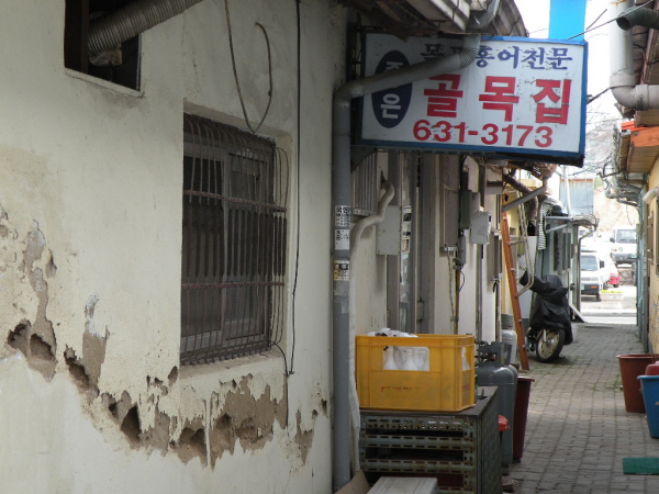 그래도 그나마 도로 변에는 사정이 나은 편이다. 뒷골목으로 들어서면 사정은 형편없다. 선술집 두어 군데에 음식점 하나, 문을 닫은 상가들만 눈에 들어온다. 선술집 한곳은 문은 열어놓았지만 거의 영업을 하고 있지 않고 음식점 한곳도 사정은 마찬가지다. 그래도 장사가 꾸준한 <골목집>은 손홍순(68) 씨가 솜씨 좋은 음식 맛으로 단골들을 확보해놓았기 때문이다. 손 씨는 이곳에서 한 10년 전부터 장사를 했는데 음식 맛이 좋아 손님들이 막걸리 한 잔 기울이고자 아직도 이곳을 찾는다고 한다. 손 씨는 "얼른 보상이 이뤄져 다른 곳으로 옮겨야지. 언제 복원이 될지도 몰라"라고 말하며 술상을 훔친다.
