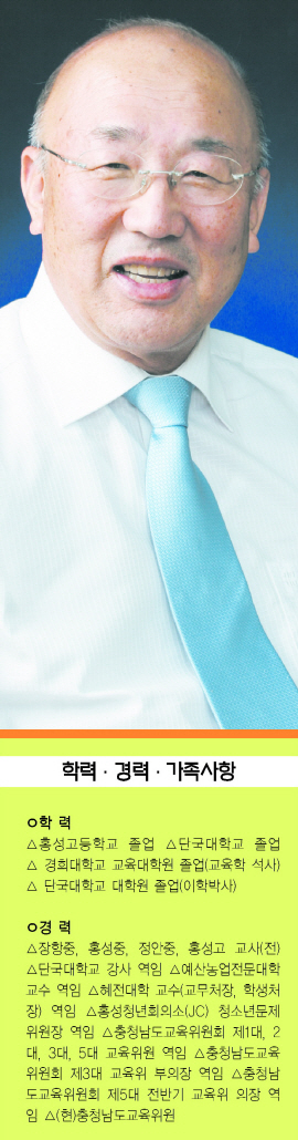 충남교육 현장의 현실과 문제점이 무엇인지 정확히 알고 있습니다. 충남교육의 산 증인으로 실질적 교육발전을 위한 정책과 대안도 만들어낼 능력이 충분합니다. 저는 학생들과 가장 가까운 편에서 동고동락을 한 교사 출신이며, 교수출신입니다. 권위를 추구하기보다 아이들과 함께 같은 눈높이에서 생활을 해 왔습니다. 그들의 고민, 꿈, 미래 등을 피부로 느끼고 있습니다. 아이들이 희망을 찾고 꿈을 이루기 위해 충남교육에서 무엇이 변해야 하는가를 저는 어느 누구보다 명확히 인식하고, 실천할 자세가 돼있습니다.