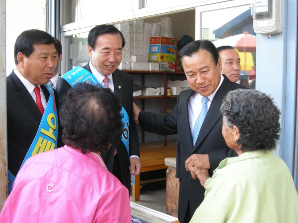 지난 13일 갈산시장에서 만난 이완구 전 지사는 지지자들에게 인사를 하며 한나라당 군수후보인 이규용 후보, 도의원 후보인 오배근 후보, 군의원 후보인 이병국 후보에 대한 지지를 호소하고 나섰다. 이날 이 전 지사는 갈산정기사장을 찾아 장을 보러온 유권자들에게 한나라당 후보들을 지지해 줄 것을 호소하며 곳곳을 돌았다. 오랜만에 선거지원에 나선 이 전 지사를 만난 지지자들은 꽃다발을 전달하는 등 식지 않은 인기는 여전해 보였다. 이 전지사가 본격적으로 한나라당 군수후보를 비롯해 출마자들의 측면지원에 나설 경우 이번 6.2지방선거의 지형을 바꿀 수 있을지에 벌써부터 관심이 모아지고 있다.