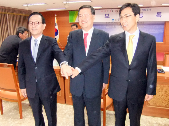 충남지사 선거의 쟁점은 단연 <세종시>다. 이완구 전 충남지사가 압도적인 지지율에도 불구하고 결국 지사직에서 물러나고 공천까지 받지 못하게 이르게 된 배경의 출발점이기도 하다. 여당후보인 한나라당 박해춘 후보는 공천이 확정되자마자 당론을 따르겠다며 사실상 세종시 수정이라는 정부 방침을 쫓고 있다. 반면 야당 후보들은 일제히 세종시 원안 사수를 외치고 있는 상황이다.