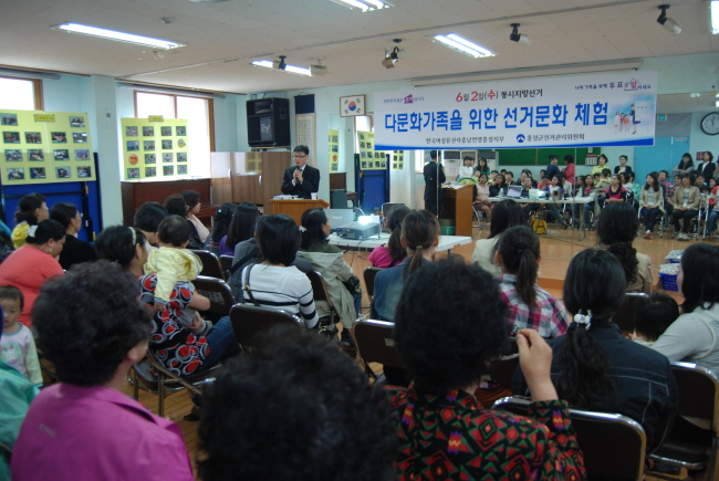 홍성군선거관리위원회(위원장 한동수)와 한국여성유권자충남연맹 홍성지부(지부장 최희숙)는 지난 10일, 사회복지관 1층 강당에서 다문화 가족을 대상으로 선거문화를 체험하는 행사를 가졌다.