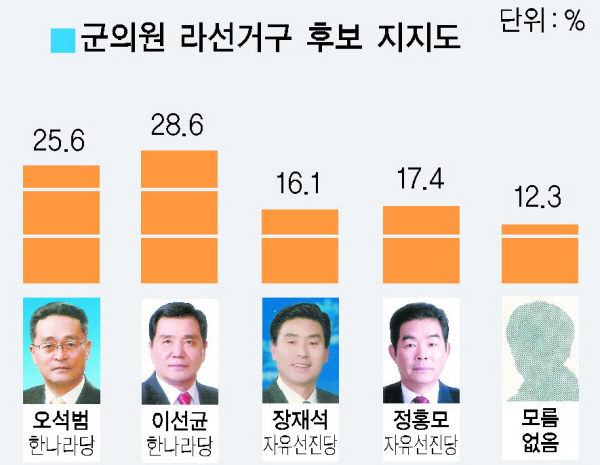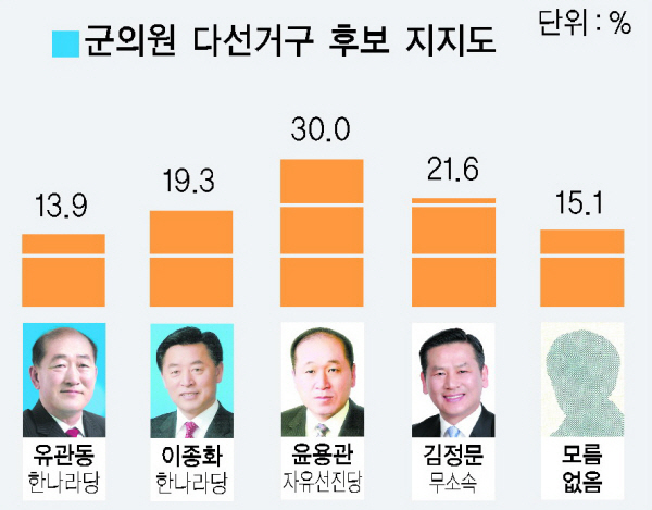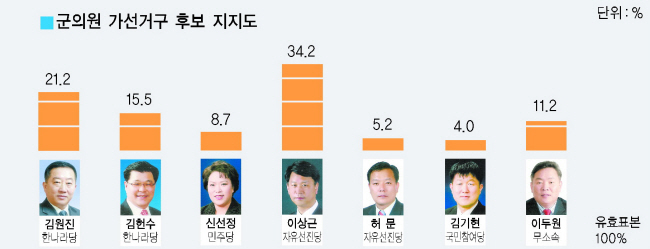 또한 가 선거구 유일의 여성후보인 민주당 신선정 후보는 8.7%의 지지율을 보이며 선전하고 있고, 자유선진당 허문 후보는 5.2%, 국민참여당 김기현 후보 4.0%로 조사됐으며, 자유선진당 군수후보 경선에 참여했다가 탈당해 군의원 선거에 무소속으로 출마한 이두원 후보는 11.2%의 지지율을 보이는 것으로 조사됐다.