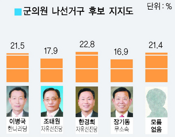 이병국·한경희 후보 접전, 조태원, 장기동 후보 순