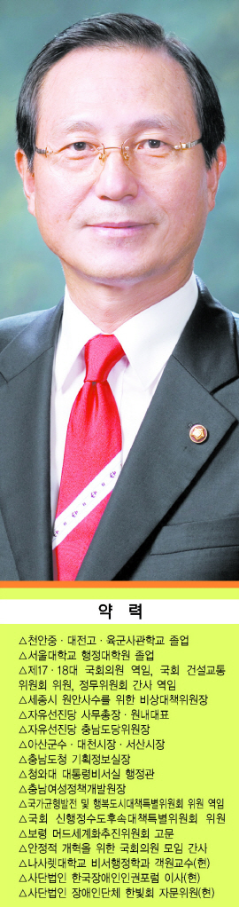 세종시 문제, 수도권 규제완화 등 이명박 정부는 충청도민을 우롱하고 우리의 자존심을 짓밟고 있다. 충남의 자존심 회복이 필요한 때이다. 선거에 나서기 전에 지역구에서 여론조사를 해보니 도지사로 출마하라는 여론이 압도적이었다. 선거구민에게 죄송한 마음이 있지만, 충청도민이 더 큰 정치를 하라고 명령을 내리신 만큼 신명을 다해 당선되도록 노력할 생각이다. 나는 23년간 공직생활을 하면서, 아산군수, 대천시장, 서산시장 그리고 충남도청 기획정보실장을 역임하는 등, 충남도 일선에서 도민들과 함께 행정을 해 왔다. 그 누구보다도 충남도를 사랑하고, 충남도민을 위해서 무엇을 해야 하는지를 잘 알고 있다. 이런 이유로 출마를 결심하게 됐으며 당선되도록 도민들이 도와 줄 것으로 생각한다.