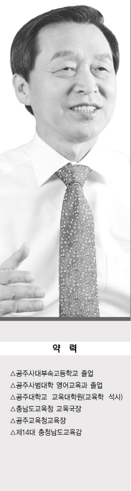 또, 내 고장 명문학교 만들기 등을 통해 교육격차를 해소하고 지역 인재의 외부 유출을 방지할 것이다. 비록 어려운 숙제이기는 하지만 공교육정상화만이 사교육비의 부담을 줄이고 충남의 교육경쟁력을 높일 수 있는 유일한 길이라는 소신이다. 선생님들의 사기를 진작, 열의와 자부심을 가진 교단을 만들어 줄 것, 행정의 비능률을 해소하고 공정 투명한 행정집행을 통한 교직사회의 활성화가 중요하다고 본다. 무엇보다 교육감의 의지와 신념에 입각한 깨끗하고 도덕적인 리더십이 절실, 비리 없는 충남교육을 반드시 실현할 것이다.