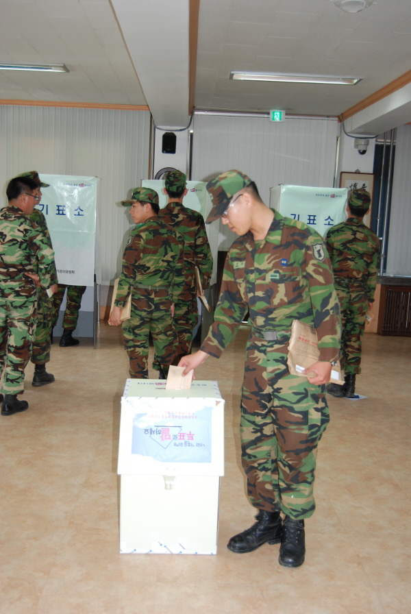 6.2 지방선거 부재자 투표가 27일부터 28일까지 이틀간 실시됐다. 유권자들은 군청 회의실에 마련된 부재자 투표소를 찾아 소중한 한표를 행사했다. 사진은 제1789부대 장병들이 부재자 투표를 마치고 투표용지를 투표함에 넣고 있다. 저작권자 © 홍주일보 무단전재 및 재배포 금지 이은주 기자 다른기사 보기 페이스북 카카오톡 URL복사 기사공유하기
