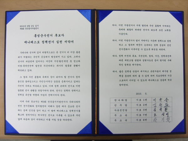 홍성군선거관리위원회(위원장 한동수)는 지난 24일, 홍성군수선거 후보자(기호 1번 한나라당 이규용, 기호 2번 민주당 김용일, 기호 3번 자유선진당 김석환, 기호 7번 무소속 조성미, 기호 8번 무소속 한기권)들이 연대 서명한 매니페스토 정책선거 실천 서약서를 공개했다.