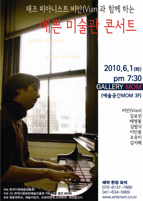 한편 예술극단 MOM은 MOM Gallery에서 오는 6월 1일 오후 7시 30분 <재즈 피아니스트 비안과 함께 하는 예쁜 미술관 콘서트>를 개최한다. 예약 및 기타 자세한 사항은 예술공간 MOM(전화 070-8137-7889)으로 문의하면 된다.