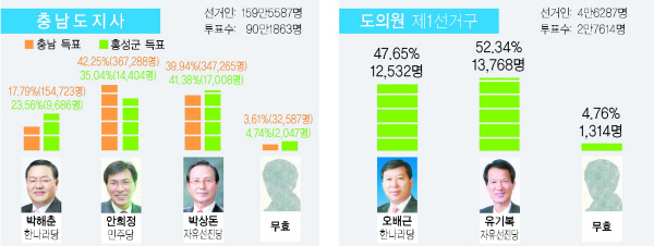 한편 충남도지사 선거에서 안희정 후보는 개표가 완료된 3일 오전 현재 총 36만7288표인 42.25%의 득표율을 얻어 34만7265표(39.94%)를 얻은 자유선진당 박상돈 후보를 2만23표(2.31%p) 차로 제치고 당선의 영광을 안았다.