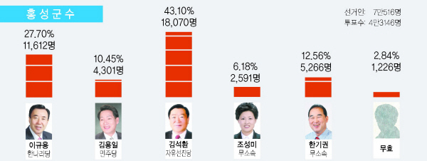 김 당선자는 또 "하루빨리 공무원 조직을 안정시키고 변화와 개혁을 완수하라는 군민들의 지엄한 명령으로 받아들이겠다"며 "저와 함께 마지막까지 선의의 경쟁을 펼쳐주신 네 후보님들께도 심심한 위로의 말씀을 드린다"고 밝혔다.