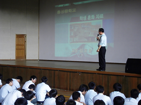홍성중학교(교장 임도순)는 지난 7일 아침조회 시간에 영상으로 펼쳐진 이색적인 훈화 시간을 가졌다. <나는 누구인가>라는 주제로 열린 임도순 교장의 훈화는 시스타나 성당에 있는 미켈란젤로의 천장화(천지창조와 최후의 심판)로 학생들에게 자기 동기 부여가 얼마나 중요한지를 알리며 흥미를 이끌었다. 이어 각계각층의 유명 인사들의 <노력과 열정, 불굴의 투지와 자존심, 그리고 끊임없는 도전과 성공>으로 사는 모습을 보여줌으로써 나 자신이 누구인가에 대한 깊은 생각을 갖는 유익한 시간을 마련했다.