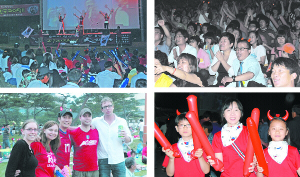 2010 남아공 월드컵 B조 1차전 대한민국 vs 그리스 전이 열리던 지난 12일 홍성군청 후정과 광천하상주차장에 모인 군민들은 빗줄기에도 아랑곳하지 않고 "대~한민국"을 외치며 열광했다.