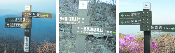 향적봉이 엎어지면 코에 닿을 듯하다. 향적봉과 빼재(신풍령)로 가는 갈림길이다. 향적봉 2.1km, 횡경재는 3.2km 거리다. 여기서 백두대간은 향적봉을 앞에 두고 오른쪽으로 90도 휘어서 간다. 배낭을 백암봉에 벗어 숲속에 숨겨놓고 향적봉을 갔다 오기로 한다. 맨몸으로 산길을 걸으니 날아갈 것만 같다. 중봉을 지나 덕유평전을 거쳐 10시 20분 덕유산의 최고봉인 향적봉(1.614m)에 오른다. 중봉, 백암봉, 무룡산, 삿갓봉, 남덕유산의 준봉들은 물론 저멀리 지리산, 가야산, 기백산, 적상산 등 준봉들이 장쾌하게 펼쳐진다. 1975년 2월 국립공원으로 지정되었으며 남한에서 네 번째로 높은산이다.