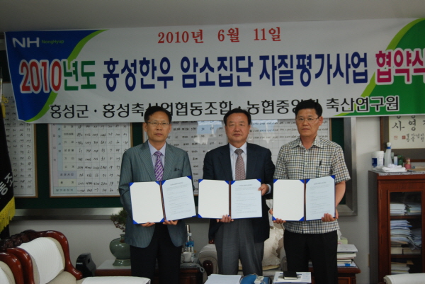홍성군과 홍성축산업협동조합(조합장 유창균)은 지난 11일 농협중앙회 축산연구원(원장 이명일)과 <2010암소집단 자질평가사업> 협약을 체결했다.