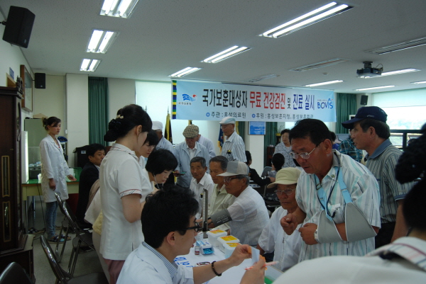 홍성의료원(원장 신덕철)은 지난 22일 보훈회관에서 국가유공자와 유족 200여명을 대상으로 무료 건강검진 및 진료를 실시했다. 이번 건강검진은 국가보훈대상자 위탁병원인 홍성의료원 주관으로 신체계측, 소변검사, 혈액질환검사 등 16개 항목에 대한 검진이 실시됐으며 한국농어촌공사홍성지사 홍주봉사단에서 마련한 돋보기안경을 참석자 전원에게 나눠주고 보훈가족의 건강한 노후생활을 위한 금연클리닉 및 호스피스에 대한 강의도 함께 실시했다.