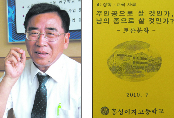 평소 교직원들에게 단순히 교과서를 전수하는데 급급하지 말고 학생들에게 토론방식의 수업을 진행해 학생들이 자신의 뜻을 펼치며 삶의 주인공이 될 수 있도록 지도하라고 강조하는 이 교장은 탈무드의 '너희가 한마디 하고 싶거든 반드시 두 마디를 들어라, 단, 그 두마디는 반드시 반대말이어야 한다'는 글귀를 예로 들면서 "올바른 토의문화가 정착되지 않으면 시행착오의 반복이 될 수 있다"며 "이는 어느 쪽에도 치우치지 말고 자기 주장을 갖고 올바른 말을 할 때 비로소 자기 삶의 주인공이 된다"고 강조했다.