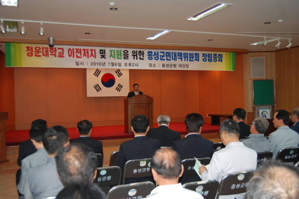인천 청라지구에 제2캠퍼스를 조성하고 물류학과 등 9개 학과를 이전하려는 청운대학교의 계획을 막기 위해 구성된 청운대 이전 저지 및 지원을 위한 홍성군민 대책위원회(이하 대책위)가 창립총회를 가졌다.