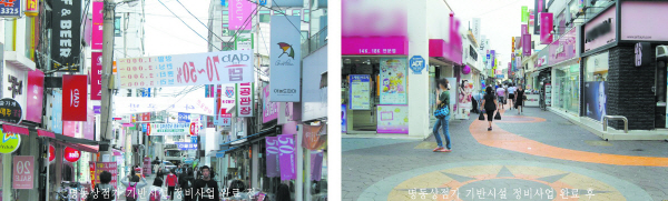 특히 새로 설치한 가로등(보안등)에는 LED조명을 활용해 빛의 거리로 변화시켰고, 도로에는 문양을 새겨 넣고 칼라무늬로 포장하여 거리에는 새로운 활력을 불어넣었다. 도로에 새겨 넣은 문양이 간혹 높은 구두를 신은 고객들에게 불편함을 줄까 우려하기도 했다는 것이 관계자의 설명이다. 하지만 상인들은 도로에 파인 홈으로 먼지 등이 뭉쳐 있다가 빗물에 씻겨 내려가도록 하는 기능을 하고 있어 오히려 거리에 먼지날림 현상이 현저히 줄어 쾌적한 거리가 됐다고 반기는 목소리다. 또한 상점가의 전기 및 통신설비 정비(전선 지중화 및 스피커 교체)를 통해 상인들과 고객들이 보다 쾌적하고 편리하게 쇼핑을 즐길 수 있도록 했다는 평이다.