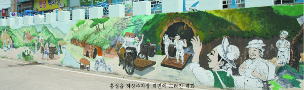 한편 하상주차장의 벽화가 사람들의 시선을 사로잡고 있다. 로하스내포조형연구소(소장 주남수)가 제안해 진행되고 있는 이 벽화작업은 높이가 2미터, 길이가 150미터에 이르는 구간에서 진행되고 있다. <길로 통한다>는 콘셉트로 광천의 옹암포구와 서부 궁리포구를 출발한 부보상들이 홍주성 안의 시장으로 들어오는 길에서의 과정을 그림으로 표현하고 있다는 설명이다. 홍성장터축제와 맞물려 홍성의 육군상무우사의 부보상들의 활약상을 벽화를 통해 표현함으로써 현대인과 친숙해지고 홍성전통시장이 형성되는 곳이라는 특성을 살릴 수 있는 공간을 활용했다는데 의미가 있다는 여론이다. 앞으로 홍성의 경제사회적, 문화적 기반이 얼마나 새로운 구상으로 어떠한 곳에서 어떠한 방법으로 어떻게 접목해 홍성이란 도시의 환경을 재생시킬지 주목된다. 홍성의 도시재생이 결국은 홍성의 얼굴이기 때문이다.