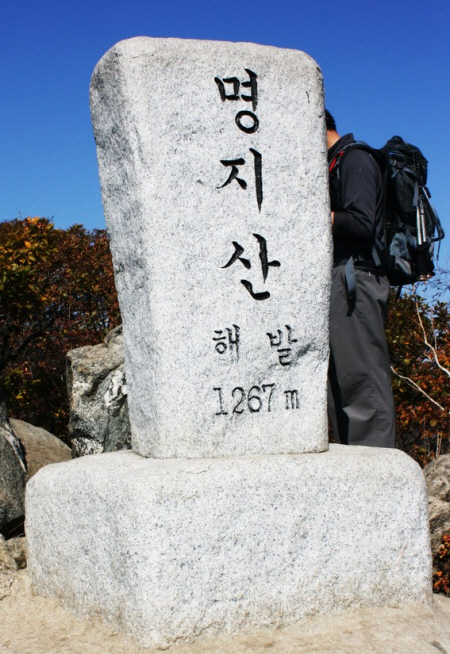 아재비 고개를 뒤로 한 채 14:20분 길을 덮고 있는 키가 큰 이름 모를 야생초들을 헤치고 길을 넓히면서 명지 3봉을 향해 가파른 길을 오른다. 전망이 좋은 바위에 앉아 때늦은 점심을 한다. 장수 막걸리 한잔에 갈증을 풀고, 연인산을 스쳐 지나가는 구름에 모습이 감춰졌다가 드러내기를 반복하는 모습을 바라보니 참으로 장관이다. 풀이 덮고 있던 길은 끝이 나고 귀목고개 갈림길 이정표가 나타난다. 그리고 10여 미터 더 오르면 시야가 탁 트인 명지 3봉(1199m)에 15:00경 올라선다. 까탈스러운 바위투성이의 능선 길을 미끄러지지 않도록 주의하면서 암릉과 무명 봉우리를 로프를 타기도 하며 몇 차례 오르락내리락 하던 끝에 명지 2봉(1250m)을 거쳐 드디어 16:00 명지산(1267m)정상이다. 명지산 정상에서의 조망은 일품이다, 발아래 가물 가물보이는 적목리 너머 경기 최고봉인 화악산을 비롯하여 북으로 강씨봉과, 귀목봉, 청계산, 남으로 연인산과 매봉으로 이어지는 장쾌한 능선이 펼쳐진다. 또 날씨가 좋은 날이면 저 멀리 북한산 백운대가 하얗게 속살을 드러낸다. 정상에 머무른 지도 잠시 16:10경 하산을 시작한다. 이정표에는 익근리까지 6km 넘게 표기가 되어있다.