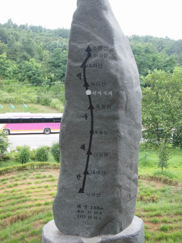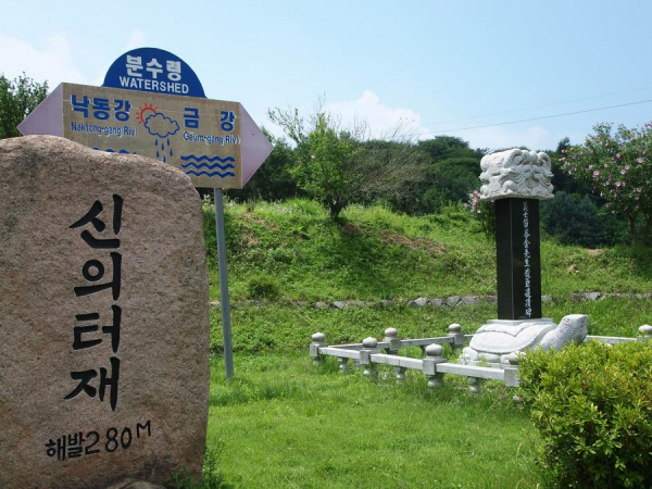선유동 삼거리를 지나 급경사 내리막 계곡길을 한참이나 내려서면 멀리 가로놓인 지기재고개가 보이고 앞선 일행은 종착지인줄 알고 함성을 지른다. 그러나 종착지는 아직도 멀리만 있어 저기가 여기가 아니란다. 화동과 낙서를 지나는 25번 지방도로에 금강과 낙동강 분수령이라는 안내표지판이 서있고 우측에는 승정원 좌승지를 지냈다는 창녕 성씨의 큰 비석이 거북이등 위에 세워져 있다. 지기재를 뒤로하고 금은골 뒷산을 지나 오른쪽으로 방향을 바꾸어 능선을 내려서면 안쑥 밭골논이 펼쳐진다. 송전탑을 지나 오늘의 날머리인 신의터재(280m)에 도착한다(12:00).