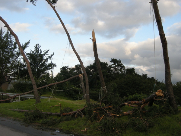도로변의 산에는 강풍으로 쓰러진 나무가 너무 많아 평소 녹음이 우거지며 푸른 빛을 띠었던 산의 모습이 아예 달라져 보였고, 조립식 공장 건물 등은 상당수가 지붕이 날아가거나 간판이 떨어지고 벽면이 무너져 내려 있었다. 도로에는 쓰러진 전신주와 가로수, 가로등이 널브러져 차량 통행에 어려움을 줬다.
