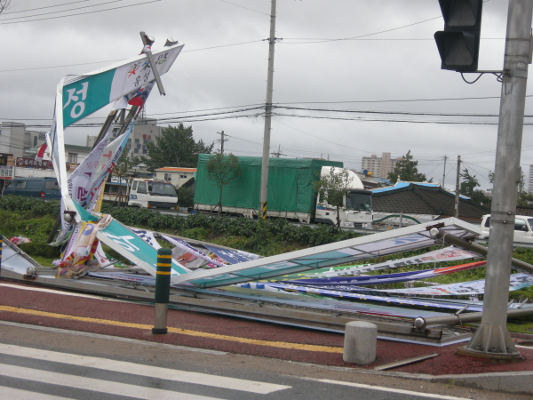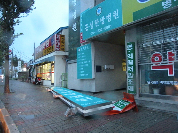 또한 현수막 게시대가 태풍에 엿가락처럼 구겨졌고, 홍성내포축제를 알리는 입간판은 폭삭 주저앉았고, 행사알림 깃발은 온데 간데 없이 사라졌다. 태풍이 몰고 온 강풍에 곳곳에서 간판과 가로수가 쓰러지고 창문이 파손되면서 부상을 입은 환자들이 속출했다. 또한 정전사고도 잇따라 홍성읍 50%, 10개 읍면 1만8000여 가구가 정전으로 불편을 겪었다.