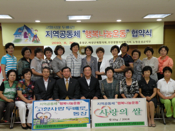 지난달 30일 농협중앙회홍성군지부 2층회의실에서 김석환 군수, 홍성군여성단체협의회 박재월 회장, 홍성군주민생활지원협의회 이동춘 회장 및 농협홍성군지부 박제완 지부장이 참여한 가운데 "고향사랑 두 배로! 지역공동체 행복나눔 협약식"을 가졌다.