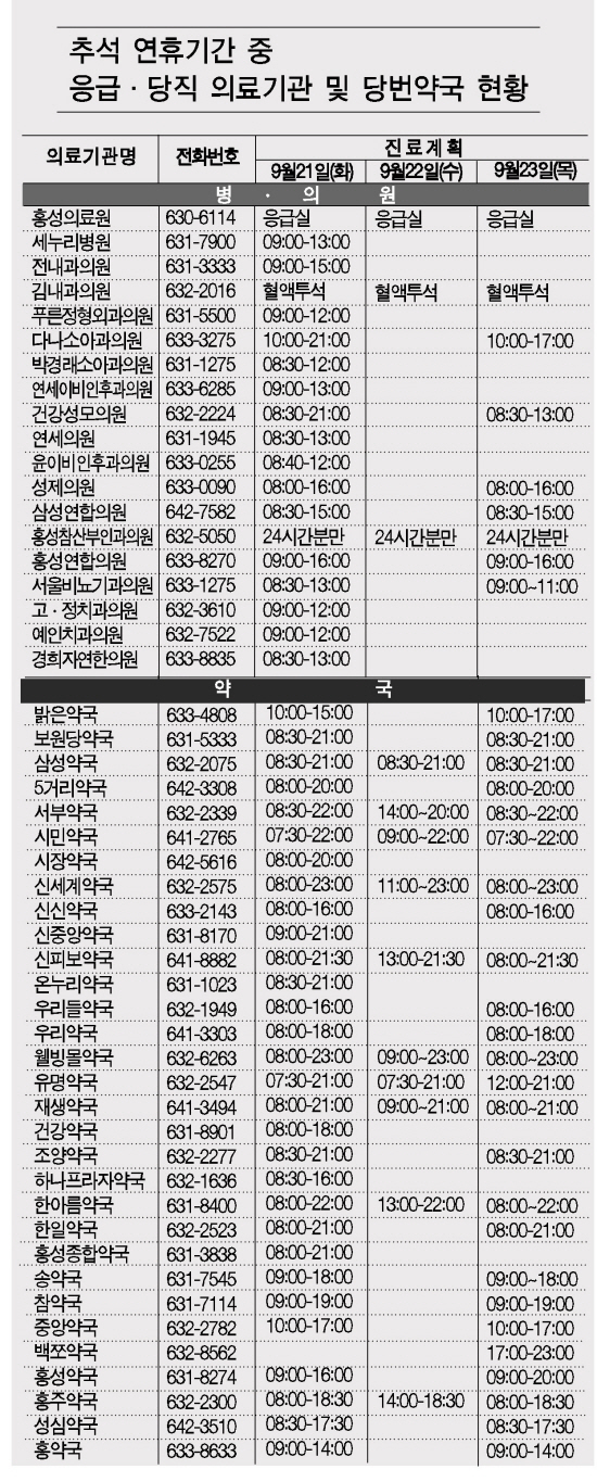 추석연휴기간중 응급ㆍ당직 의료기관 및 당번약국 현황