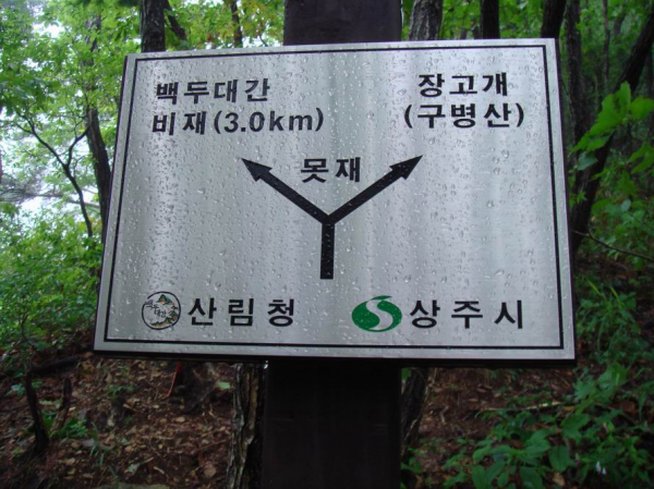 급경사의 오르막을 어렵게 봉황산(740.8m)정상에 09시 30분 오른다. '백두대간 봉황산 740.8m '표지석이 나란히 서 있는 좁은 정상이지만 확 뜨인 조망은 아름답기만 하다. 그러나 억수같이 내리는 비 때문에 아무것도 보이지 않는다. 중종의 태를 묻었다는 전설에 힘입어 화령인들이 태봉산이라고 부르는 봉황산은 1300년 전부터 봉황이 살았다는 전설이 전해져오며 송천을 발원시키는 화령의 진산이었다고 한다. 가뭄이 들면 이곳에 가서 산돼지의 피를 내어 바위에 붉게 칠을 한 뒤 정성을 들여 기우제를 지내면 반드시 비가 온다는 붉은 바위(일명 기역자바위)가 봉황산 중턱에 있고 1000년 묵은'이무기'가 살았다는 탑송이 화서면 상현1리에 있다. 봉황산을 뒤로하고 바위지대를 조심스럽게 내려오면 상촌4거리가 나오고 459봉을 지나 시야에 철계단이 길 건너 산 들머리가 보인다. 이곳이 바로 25번 지방도가 지나는 비재다. 고개의 생김새가 하늘을 나는 새의 모습이어서 비조령이라고 불렸던 곳이다. 비재에서 숨 돌린 뒤, 작은 봉우리 두어 개 쉬엄쉬엄 넘어서면 못재(655m)를 만난다. 주민들이 천지라고도 부르는 이 못의 넓이는 500~600평 되는데, 백두대간 마루금에서 유일한 못이다. 분수령에 못이 있으니 참 신기한 일이다. 못재에 전해오는 이야기는 이곳과 가까운 상주땅의 대궐터에서 군사를 일으킨 견훤은 나날이 주변 지방을 장악해 나갔다. 이때 보은의 호족인 황충장군은 삼년산성을 근거로 백두대간을 사이에 두고 견훤과 세력다툼을 하고 있었다. 하지만, 전투가 벌어질 때마다 황충은 패하기만 했다. 이에 황충은 부하를 시켜 견훤의 힘이 어디서 나오는지를 알아내도록 했다. 황충의 부하는 견훤이 못재에서 목욕하면 힘이 강해지는 사실을 알아내곤 황충에게 알렸다. 견훤이 지렁이의 자손임을 눈치챈 황충은 소금 300석을 몰래 못재에 풀었다. 그러자 견훤의 힘은 사라졌고, 마침내 황충이 승리할 수 있었다고 한다. 이 전설은, 패배한 영웅은 용이 아니라 지렁이로 격하될 수 있다는 냉혹한 현실을 일러주기도 한다. 예전엔 지금보다 수량이 훨씬 많았음을 짐작케 해준다.
