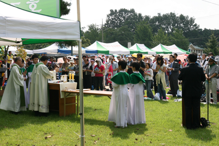 군청 여하정 앞 잔디밭에서 미사봉헌
