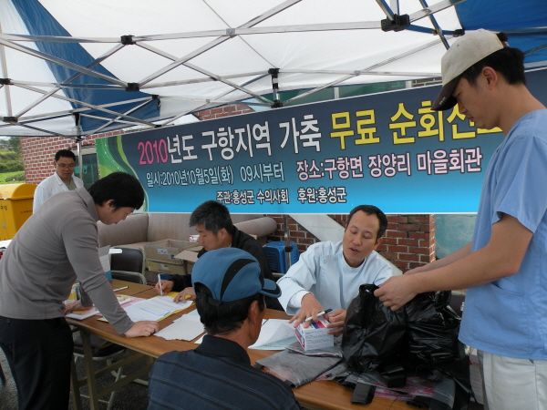 이번 진료에서는 소, 돼지, 닭, 개, 염소 등의 가축에 대한 무료진료와 양축 관련 상담을 병행 실시했으며 브루셀라 등 주요 전염병에 대한 예방활동과 가축 방역정책에 대한 지도도 함께 진행됐다. 또 홍성군수의사회가 군에서 지원받은 가축상비약품을 상담을 통해 필요한 농가에게 무료 지원되어 주민들로부터 매우 긍정적인 평가를 받았다. 구항면 주민 임용섭(62)씨는 "상비약품등과 가축에 대한 상담등 무료로 지원되 축산농가에겐 너무나 큰 도움이 된다"며 감사함을 전했다.
