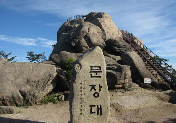 속리산 문장대 비석 뒤에 새겨진 글을 보면, ‘도는 사람을 떠나지 않는데 사람은 도를 멀리하고 산은 세속을 떠나지 않는데 세속은 산을 떠나네 하여 붙여진 속리산 문장대 구름 속에 갈무리져 운장대라 하다가 세조가 이곳에 올라 시를 지었다 하여 문장대라 했으니 우러러 우주의 장대함을 보고 구부려 품류의 번성함을 살핀다는 기묘의 극치 정상에는 알이 부화한 둥글게 파인 곳이 있으니 태초 생명탄생의 신비를 일러주도다. 동쪽으로 칠형제봉, 문수봉, 신선대, 비로봉, 천왕봉이 이어져있고 서쪽으로 관음봉, 문수봉이 솟았으며 비켜서 낙영산과 도명산이 다가선다. 남쪽 아늑한 곳에 법주사를 앉혀 법맥을 잇게 했으니 조물주의 조화여 오! 선계의 아름다움이여. -박찬선 님 글 짓고 김정홍 님 글 새김