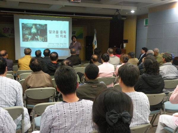 강연에 나선 의료원 정신과 신동환 과장은 "자주 마시면 중독에 빠지고 중독되면 개인 건강은 물론, 교통사고와 범죄, 가정폭력 등 사회문제를 야기하게 된다"며 "무엇보다 술에 대한 올바른 이해와 음주습관 개선이 필요하다"고 강조했다. 이어 알코올 중독자는 술병만 봐도 눈빛이 달라진다며 환자가 있는 가정에서는 절대 음주를 삼가 해야 한다고 강조했다.