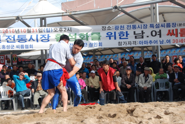 전통 민속경기인 씨름을 통해 전통시장을 찾는 고객들에게 볼거리를 제공하고 시장 활성화를 위해 마련된 제1회 광천전통시장 활성화 남ㆍ녀 씨름대회가 지난 달 31일 광천전통시장 특설씨름장에서 열렸다.